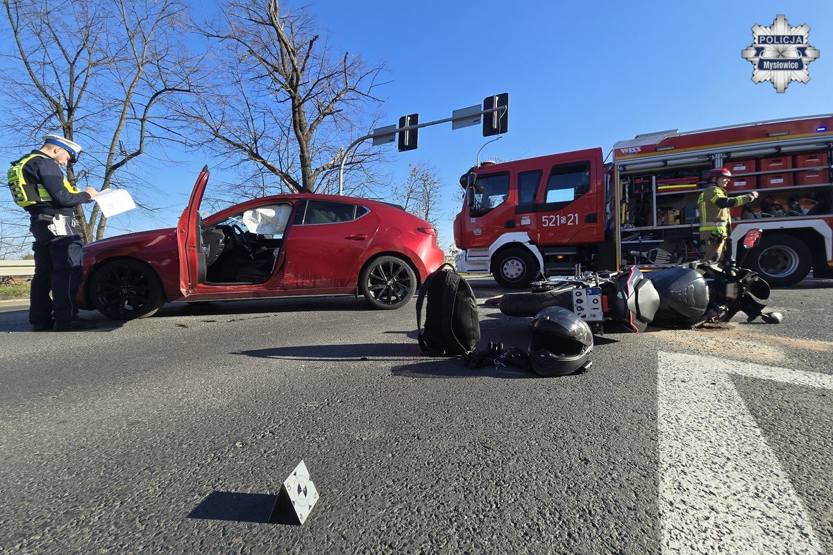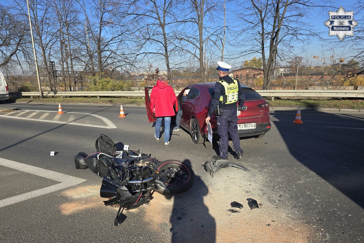 Do zdarzenia doszło dziś, 6 listopada około 11.50 na skrzyżowaniu ulic Katowickiej i Chopina. Dyżurny mysłowickiej jednostki odebrał zgłoszenie o wypadku z udziałem motocyklisty. Policjanci, którzy dotarli na miejsce ustalili, że kierujący mazdą jadąc ulicą Chopina, skręcając w lewo w Katowicką, nie ustąpił pierwszeństwa prawidłowo jadącemu w stronę centrum 21-letniemu motocykliście.