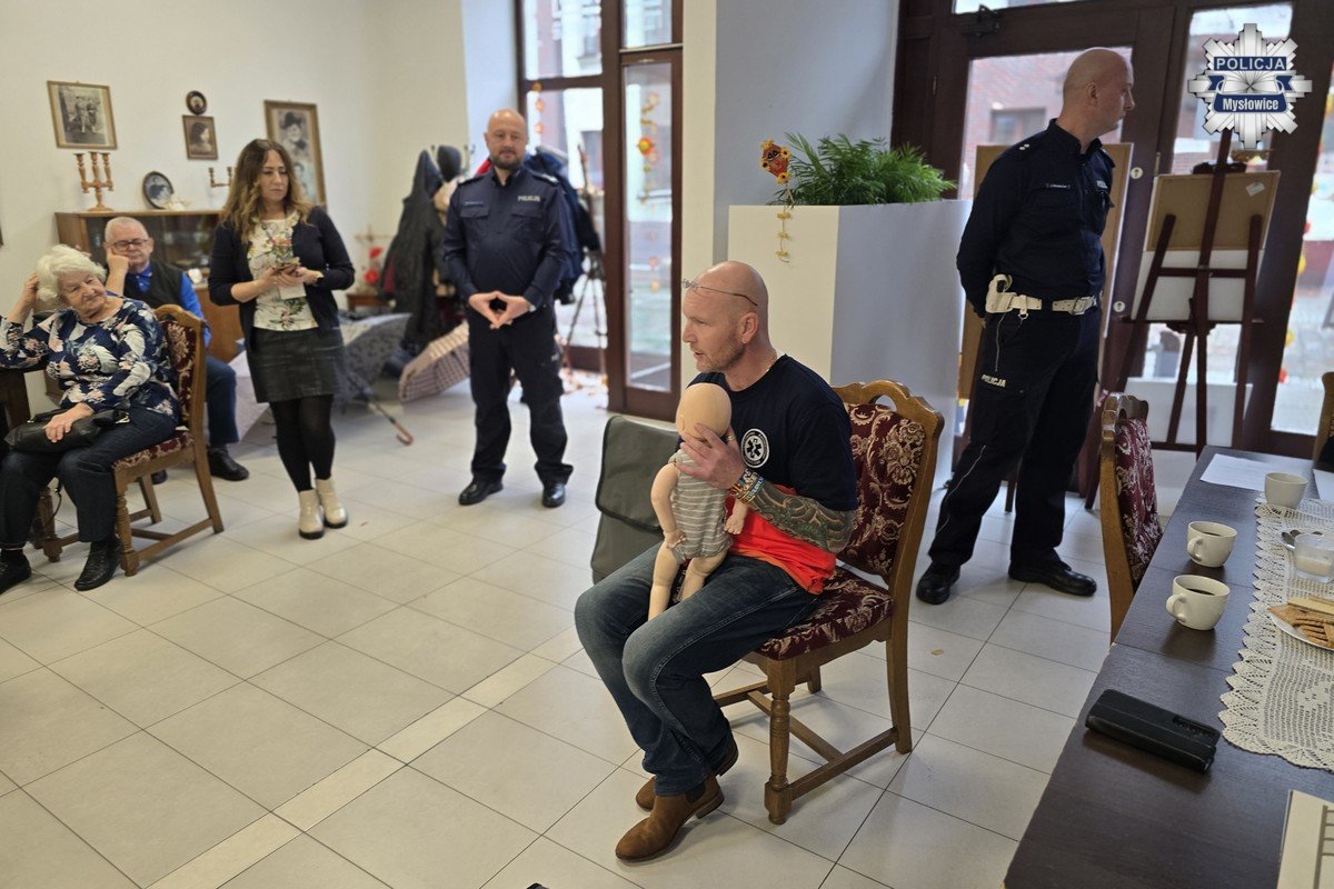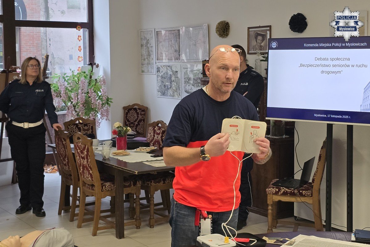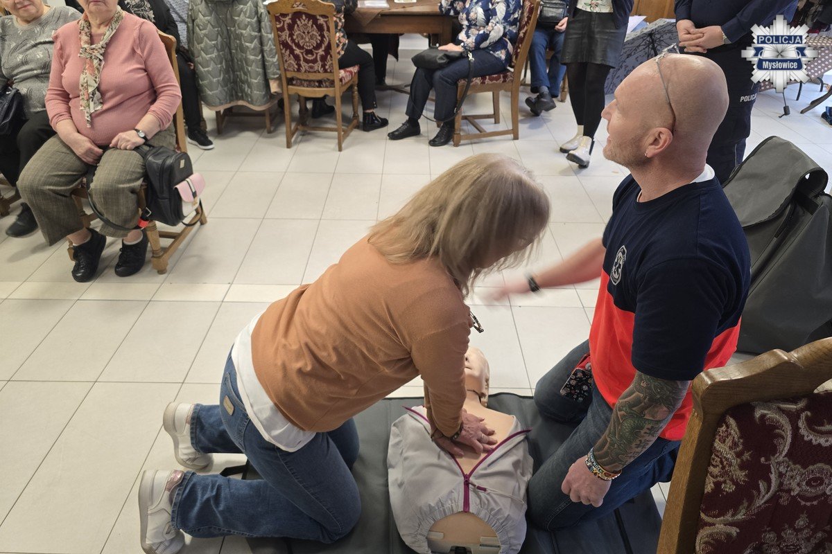 Bardzo ważnym elementem wczorajszego spotkania, była część poświęcona pierwszej pomocy. Przedstawiciel Wojewódzkiego Pogotowia Ratunkowego w Katowicach, który na co dzień szkoli innych z zakresu pierwszej pomocy, ale też pomaga poszkodowanym w wypadkach drogowych, omówił i zaprezentował zgromadzonym podstawy udzielania pierwszej pomocy zarówno osobom dorosłym, jak i dzieciom. Seniorzy mogli przećwiczyć na manekinach wykonywanie RKO, poznali także zasadę działania urządzeń AED.