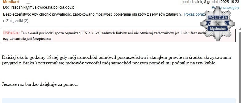 Na skrzynkę mailową Oficera Prasowego Komendy Miejskiej Policji w Mysłowicach wpłynęły podziękowania skierowane do policjantów z mysłowickiej drogówki, którzy pomogli kobiecie przy awarii jej samochodu.