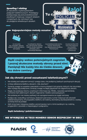 Każdego dnia wykonujemy i odbieramy połączenia telefoniczne. Warto zwracać uwagę na to, kto i w jaki sposób się z nami kontaktuje. Może okazać się, że rozmówca próbuje nas zmanipulować i oszukać. Pamiętajmy, że metod, które stosują przestępcy, jest wiele, ale na przestępstwo z wykorzystaniem połączeń telefonicznych narażony jest każdy z nas! Jeśli rozmówca będzie żądał od nas danych osobowych lub podjęcia pewnych działań (np. zainstalowania aplikacji, zlecenia przelewu, wypłacenia gotówki) należy natychmiast rozłączyć się i zadzwonić lub udać się do najbliższej placówki banku, a w przypadku udostępnienia informacji także poinformować policję o zaistniałym zdarzeniu.
