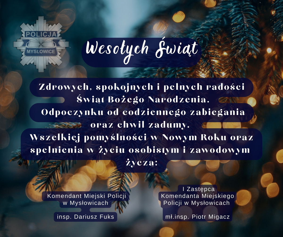 Z okazji zbliżających się świąt Bożego Narodzenia Komendant Miejski Policji w Mysłowicach insp. Dariusz Fuks, wraz ze swoim I Zastępcą mł. insp. Piotrem Migaczem życzą wszystkim policjantom oraz pracownikom KMP w Mysłowicach i mieszkańcom Mysłowic, aby te pełne tradycji chwile wypełnione były ciepłem, nadzieją i radością. Żeby w tych szczególnych dniach towarzyszyła nam atmosfera miłości, zapach choinki oraz śpiew kolęd.