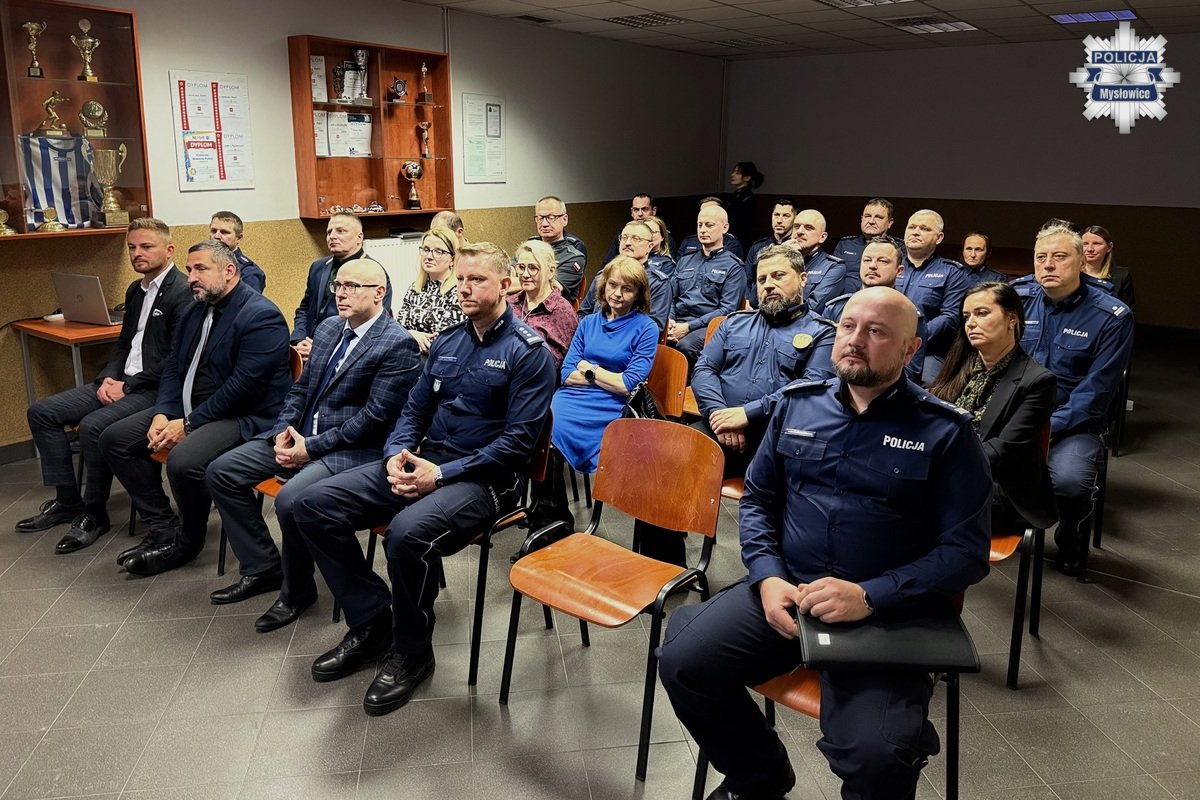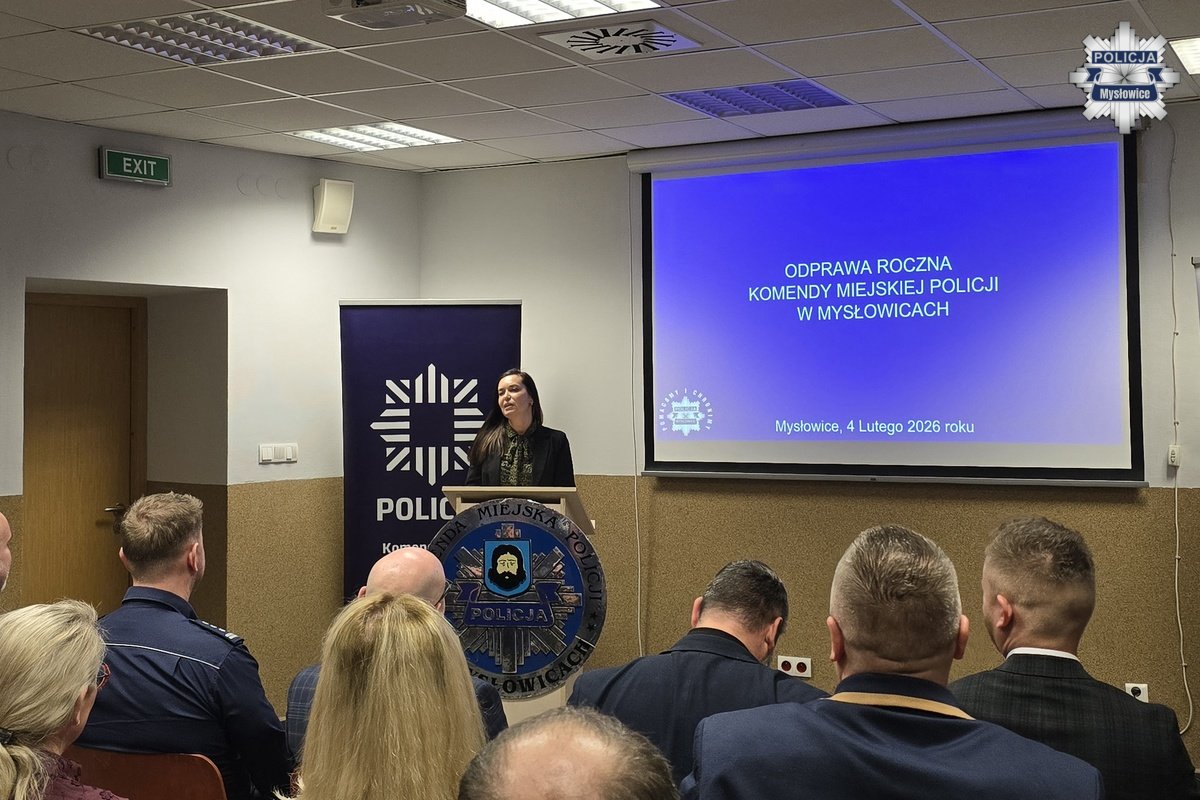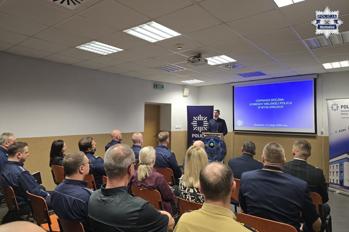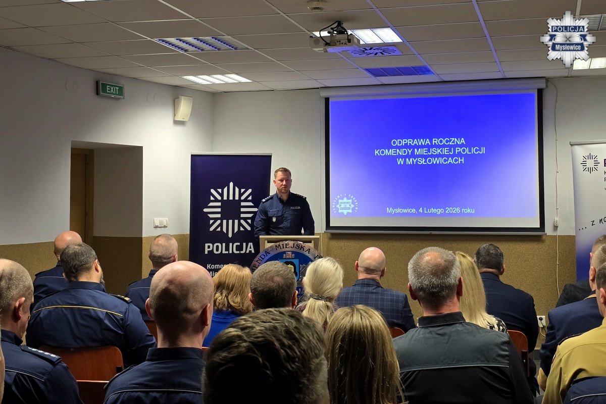 Dzisiaj, w sali odpraw Komendy Miejskiej Policji w Mysłowicach odbyła się odprawa podsumowująca wyniki pracy mundurowych w 2025 roku. W obecności władz miasta, przedstawicieli prokuratury oraz służb mundurowych, stróże prawa podsumowali efekty pracy w minionym roku oraz nakreślili priorytety na nowy rok. W naradzie uczestniczył I Zastępca Komendanta Wojewódzkiego Policji w Katowicach insp. Radosław Kacprzak.