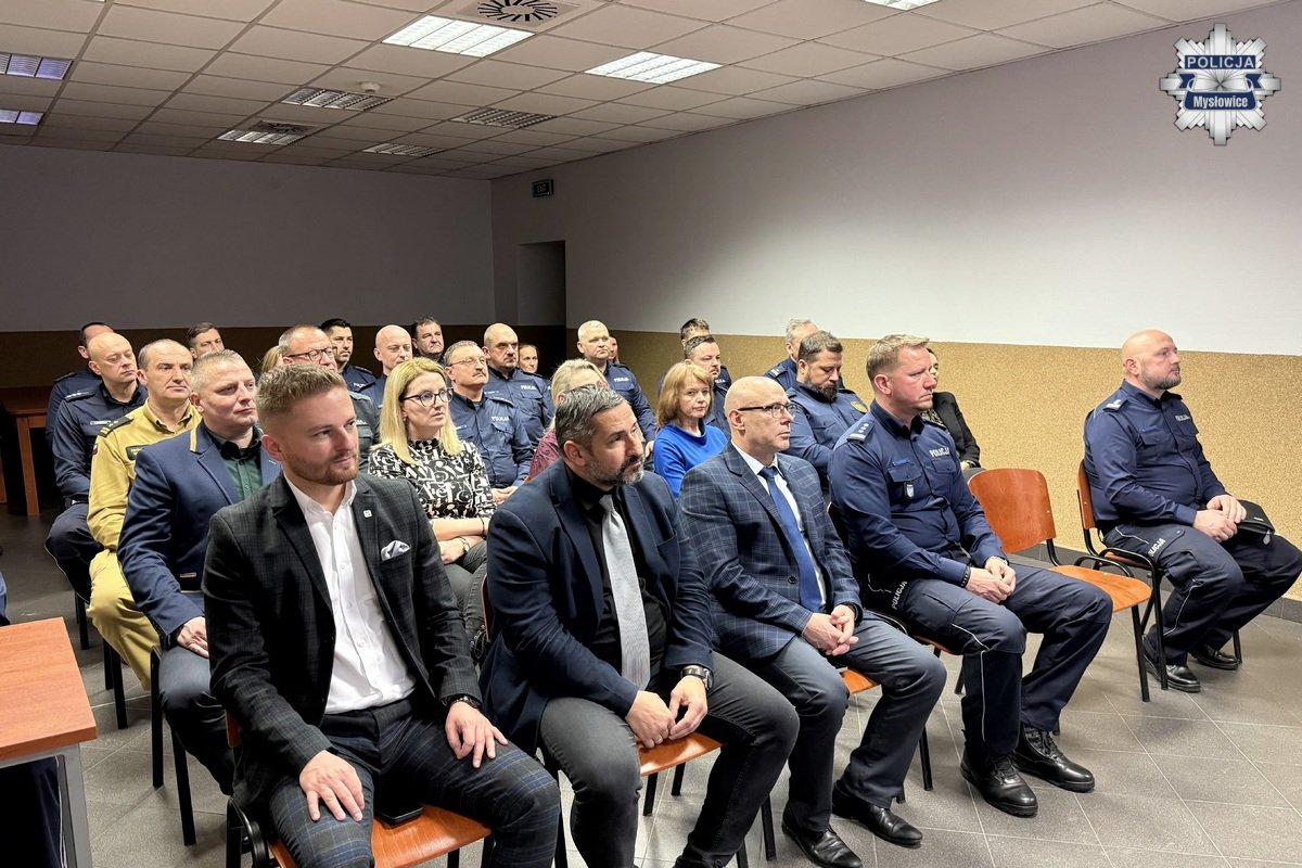 Odprawa podsumowująca efekty uzyskane przez mysłowicką jednostkę odbyła się dzisiaj, 4 lutego w sali odpraw Komendy Miejskiej Policji w Mysłowicach. Uczestniczył w niej I Zastępca Komendanta Wojewódzkiego Policji w Katowicach insp. Radosław Kacprzak. Wśród gości zasiedli Prezydent Miasta Mysłowice Dariusz Wójtowicz, I Zastępca Prezydenta Miasta Mysłowice Wojciech Chmiel, Zastępca Prezydenta Miasta Mysłowice Mateusz Targoś, Prokurator Rejonowy w Mysłowicach Marta Bińkowska, Wiceprezes Sądu Rejonowego w Mysłowicach Beata Długajczyk, Zastępca Komendanta Miejskiego Państwowej Straży Pożarnej w Mysłowicach bryg. Zbigniew Gnacik, Dyrektor Aresztu Śledczego w Mysłowicach ppłk. Waldemar Turczynowski, Komendant Straży Miejskiej w Mysłowicach Dawid Skutela, Przewodniczący Komisji Samorządności i Przestrzegania Prawa Rady Miasta Mysłowice Adrian Panasiuk, Pani Prezes Stowarzyszenia Koła Emerytów i Rencistów Policyjnych w Mysłowicach Sylwia Romaniuk oraz kadra kierownicza, policjanci i pracownicy mysłowickiej komendy.