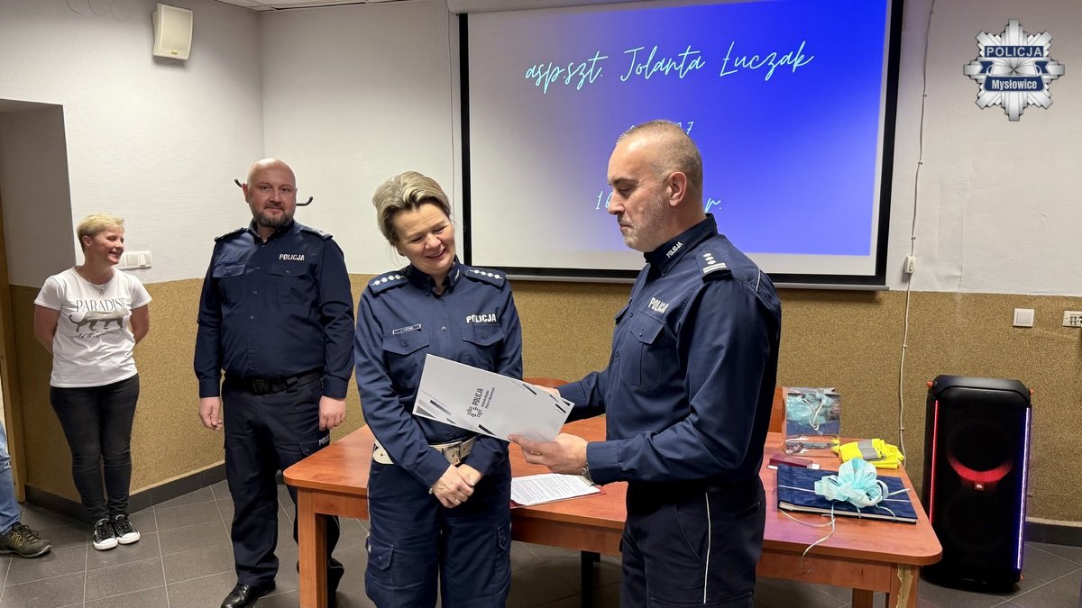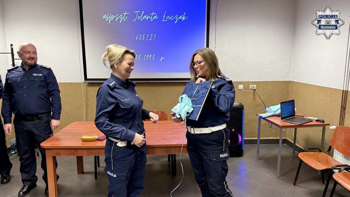 Uroczystość rozpoczął Komendant Miejski Policji w Mysłowicach insp. Dariusz Fuks, który podziękował Joli w imieniu wszystkich policjantów i pracowników komendy za długoletnią służbę, pełną zaangażowania, poświęcenia i profesjonalizmu. Następnie za współpracę podziękowała podinsp. Aleksandra Jasińska- Naczelnik Wydziału Ruchu Drogowego KMP w Mysłowicach, która podkreśliła, że mimo zakończenia służby, Jola zawsze będzie mieć przyjaciół w murach mysłowickiej Komendy.