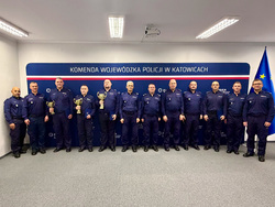 Komendant Wojewódzki Policji w Katowicach nadinsp. Mariusz Krzystyniak wraz ze swoim Zastępcą insp. Jackiem Stelmachem, spotkali się z laureatami V turnieju Służby Dyżurnej Jednostek Organizacyjnych Policji garnizonu śląskiego oraz policjantami zaangażowanymi w Ogólnopolski konkurs Policjant Ruchu Drogowego 2025.